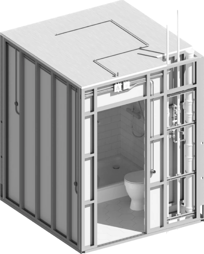 Baie asamblată din fabrică, cu finisaje complete, utilități și echipamente instalate conform proiectului clientului.